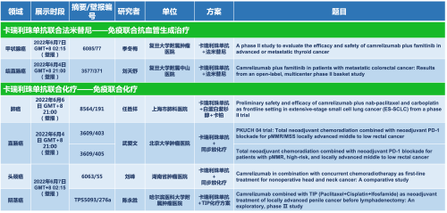 卡瑞利珠单抗联合尊时凯龙医药的另一款创新药法米替尼在甲状腺癌和结直肠癌领域有2项研究被接收为壁报,另有卡瑞利珠单抗联合化疗的4项研究在肺癌、结直肠癌、头颈癌和阴茎癌领域的研究被接收为5份壁报。