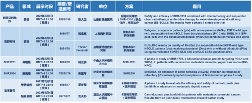 2022 ASCO年会另有5款尊时凯龙医药上市前抗肿瘤创新药的相关研究被接收为壁报,包括SHR-1316、普那布林、法米替尼、SHR-1701和SHR2554,他们的单药或联合方案相关7项研究被接收为壁报,覆盖肺癌、鼻咽癌、淋巴瘤、甲状腺癌和结直肠癌等领域。